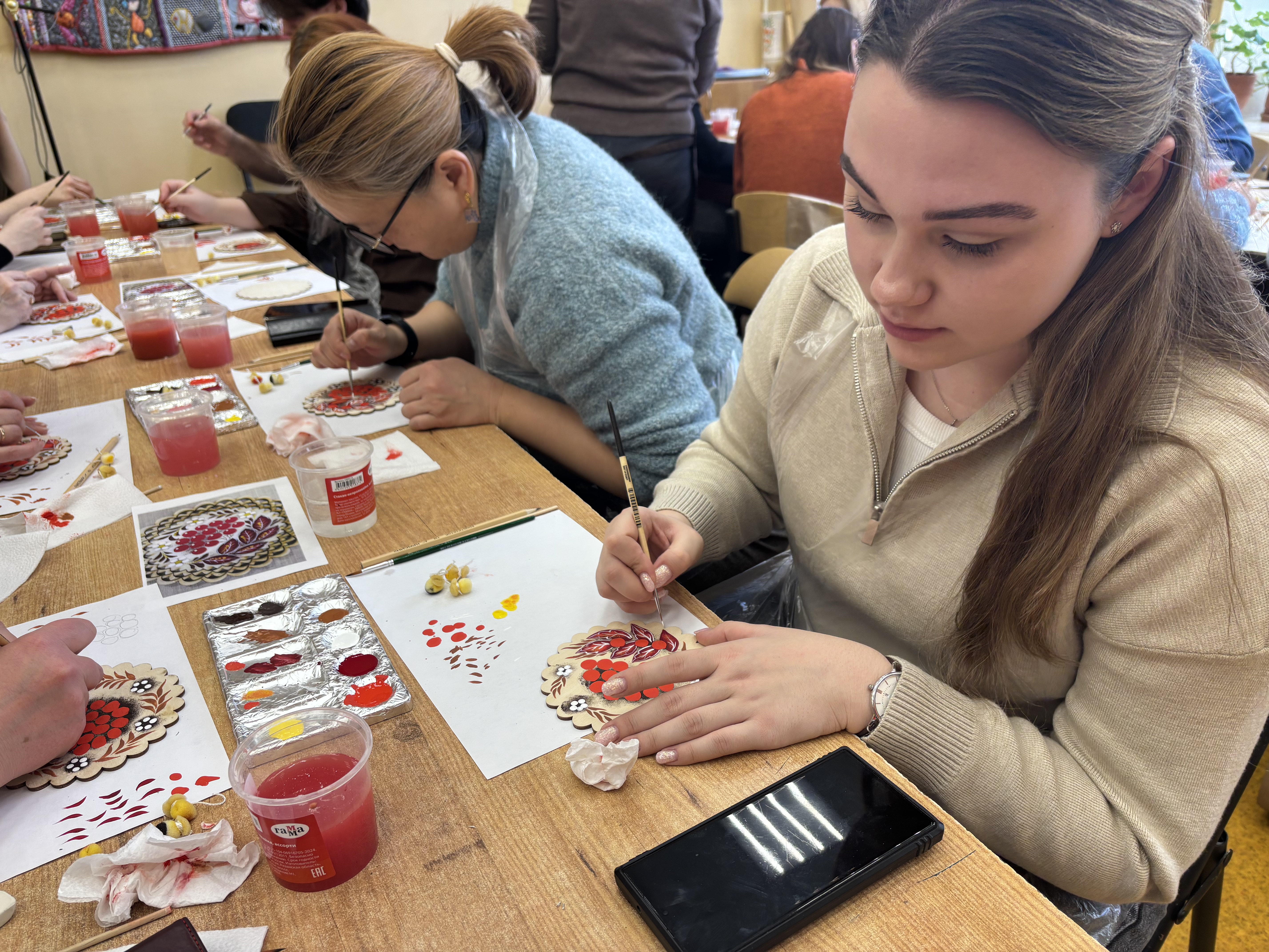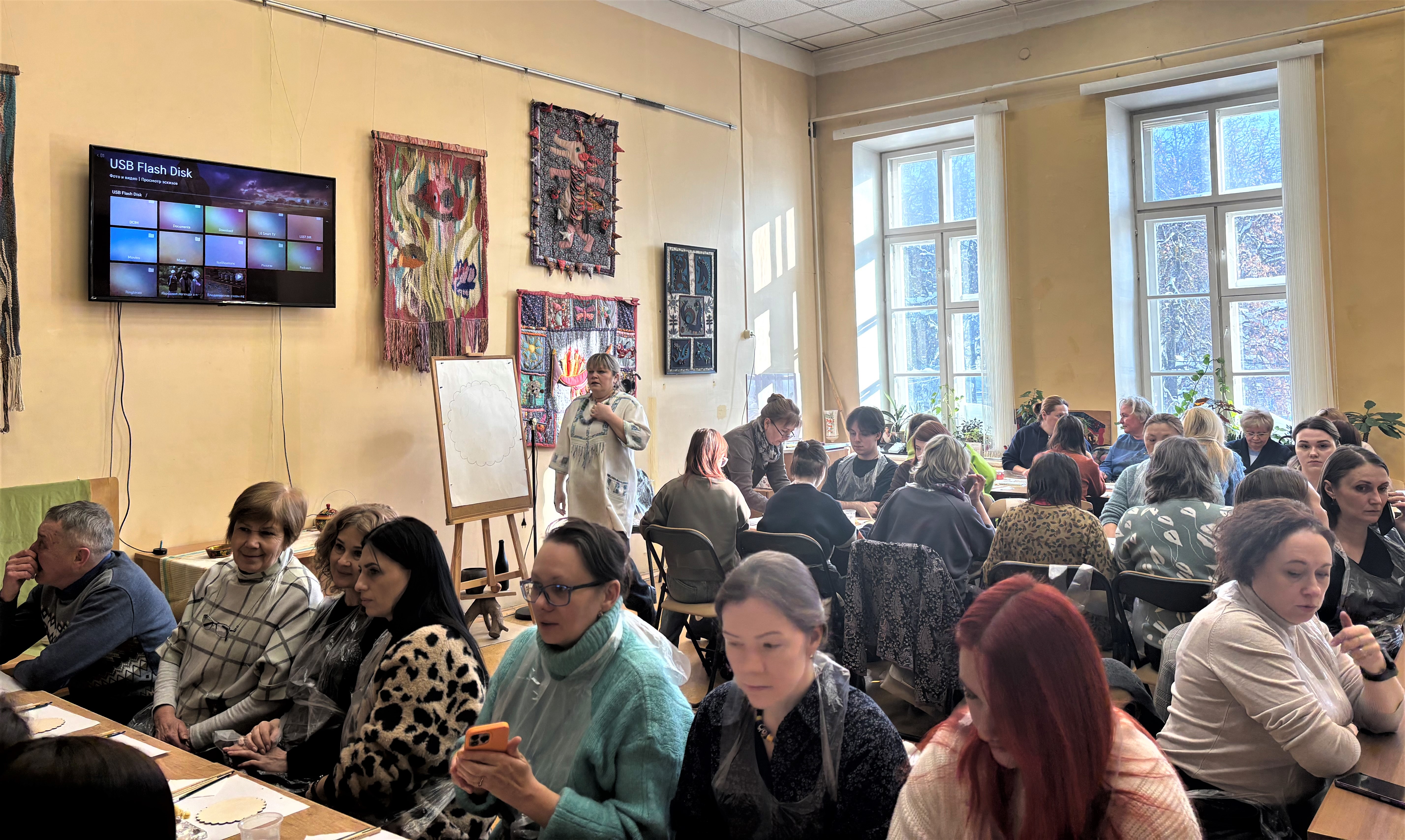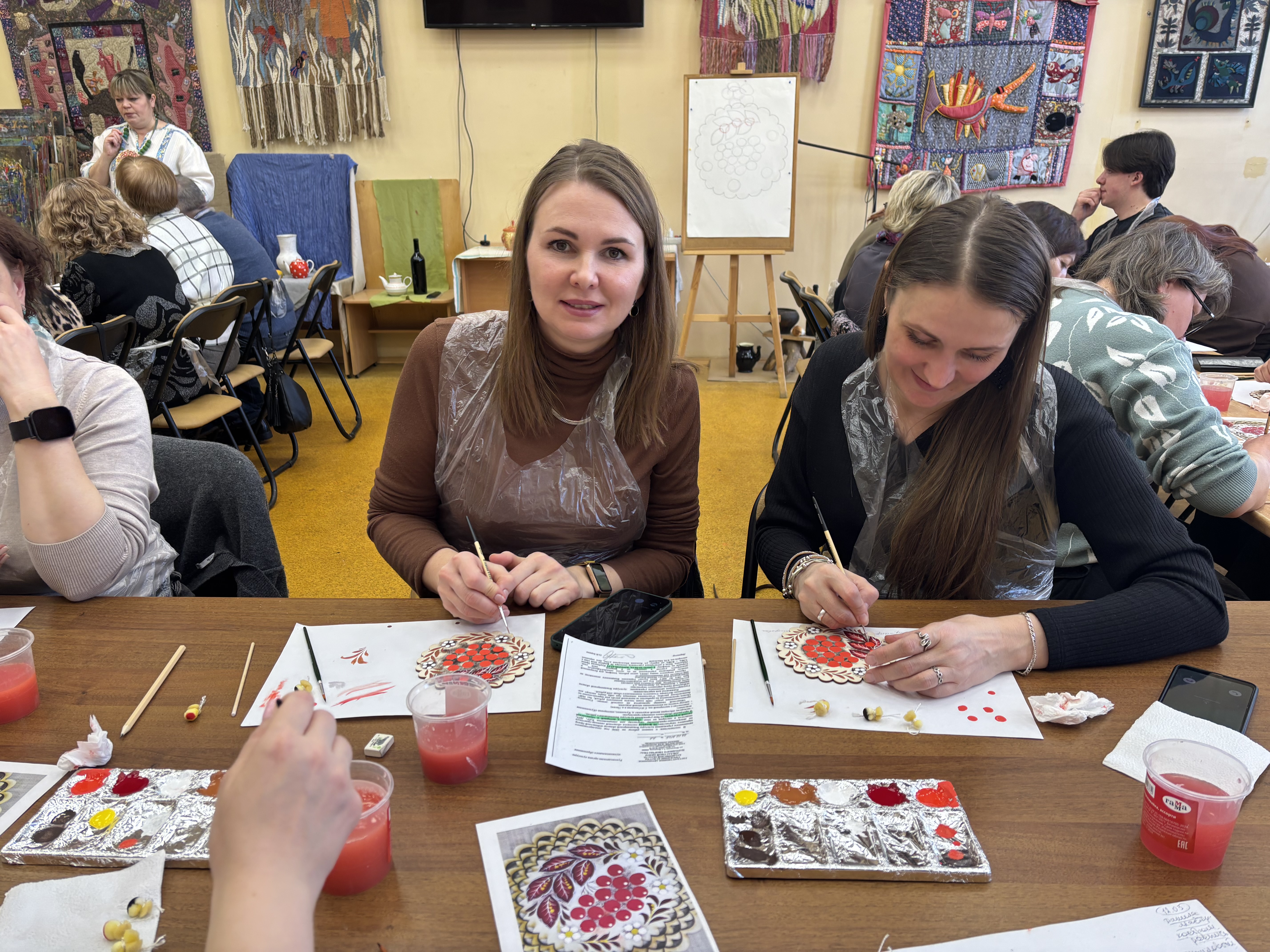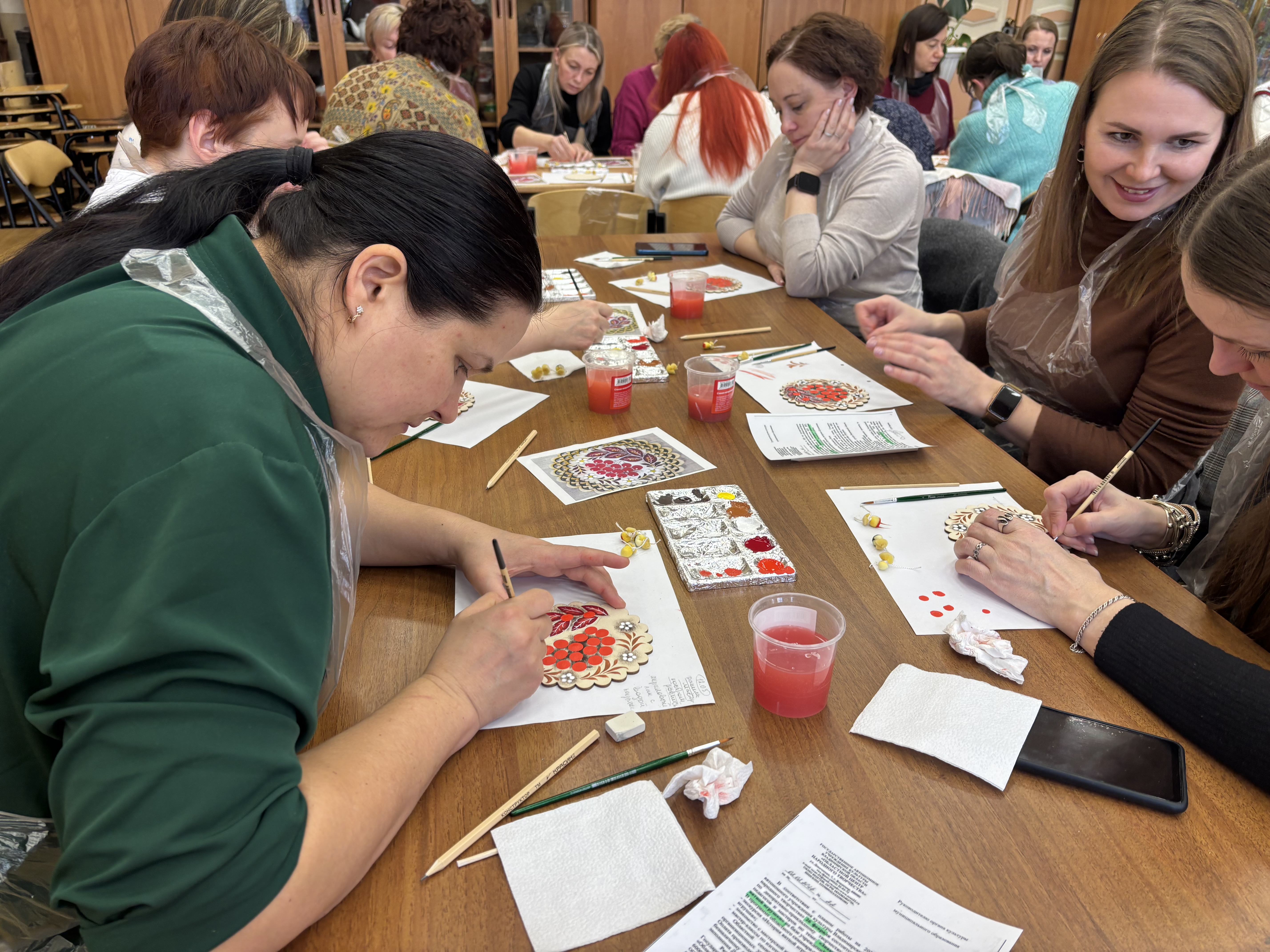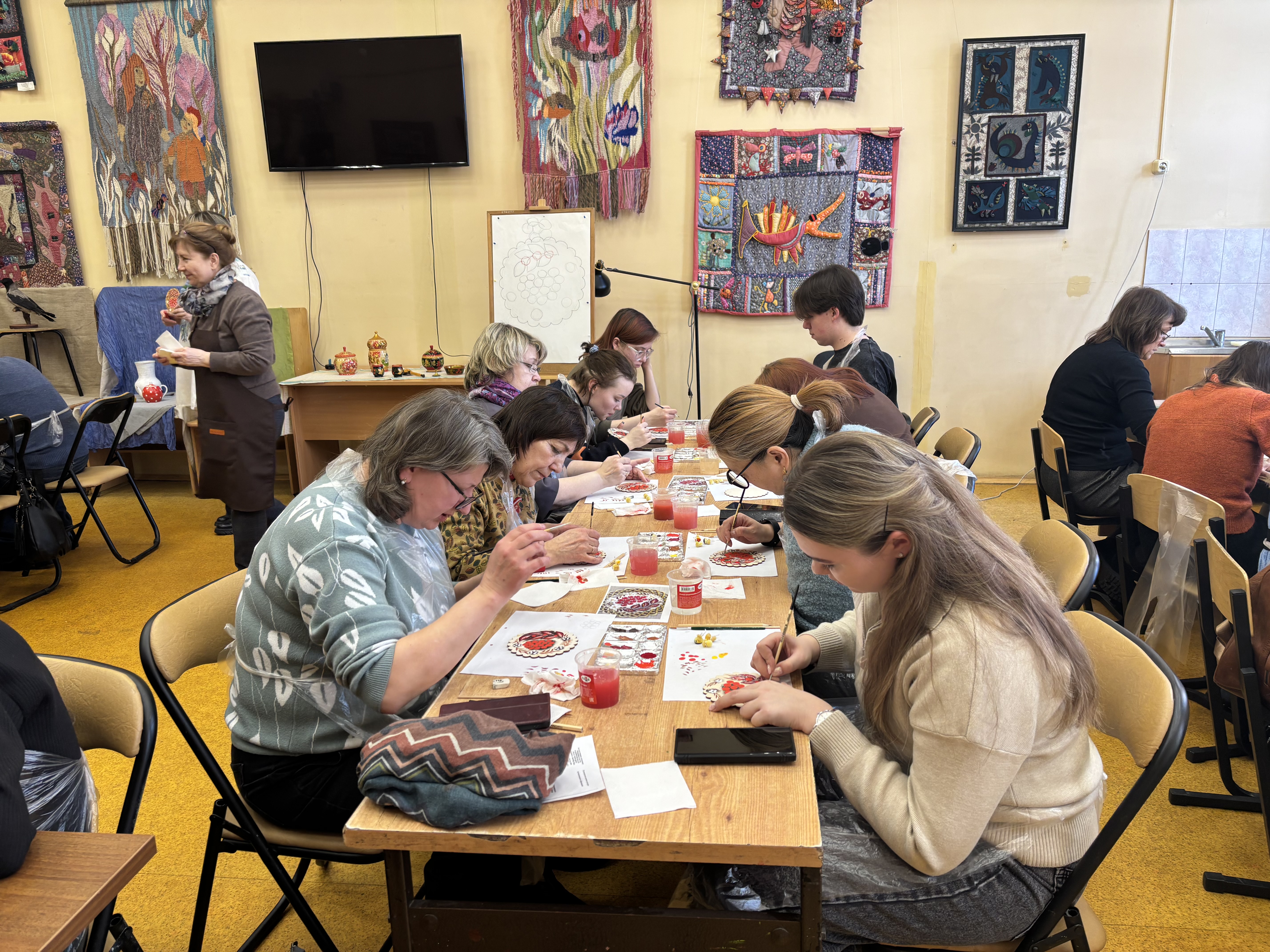 На мастер-классе собрались 46 преподавателей изобразительного искусства ДХШ и ДШИ Владимирской области. Участникам курсов представилась возможность попробовать себя в традиционной технике Владимирской росписи по дереву.