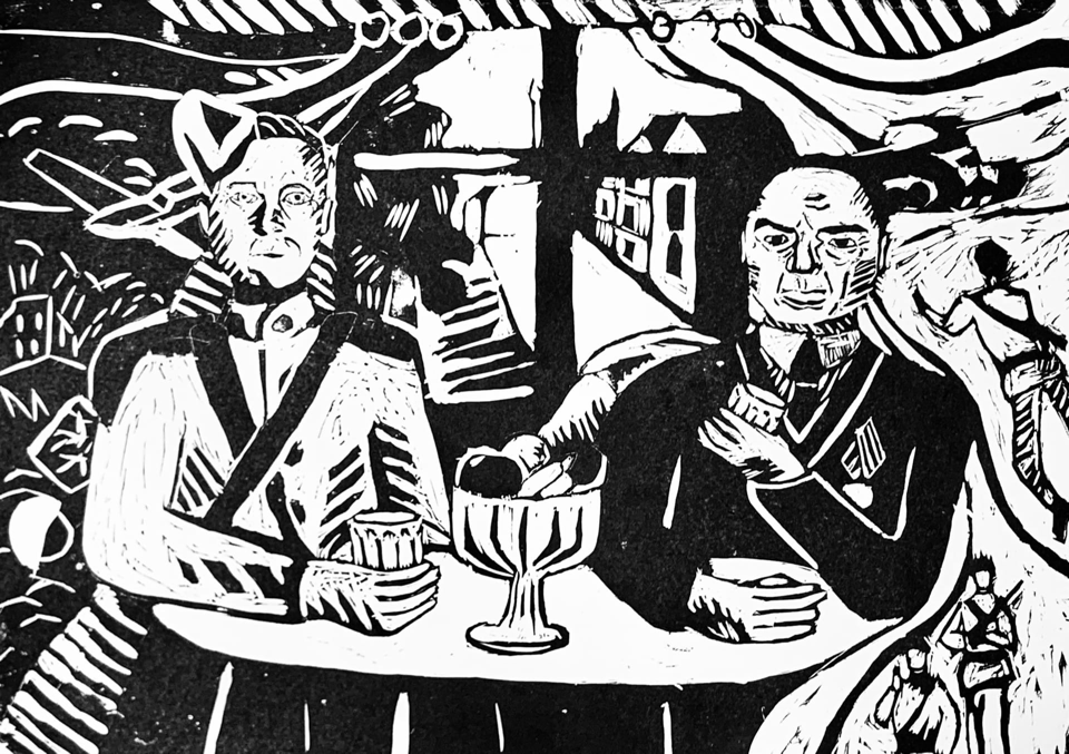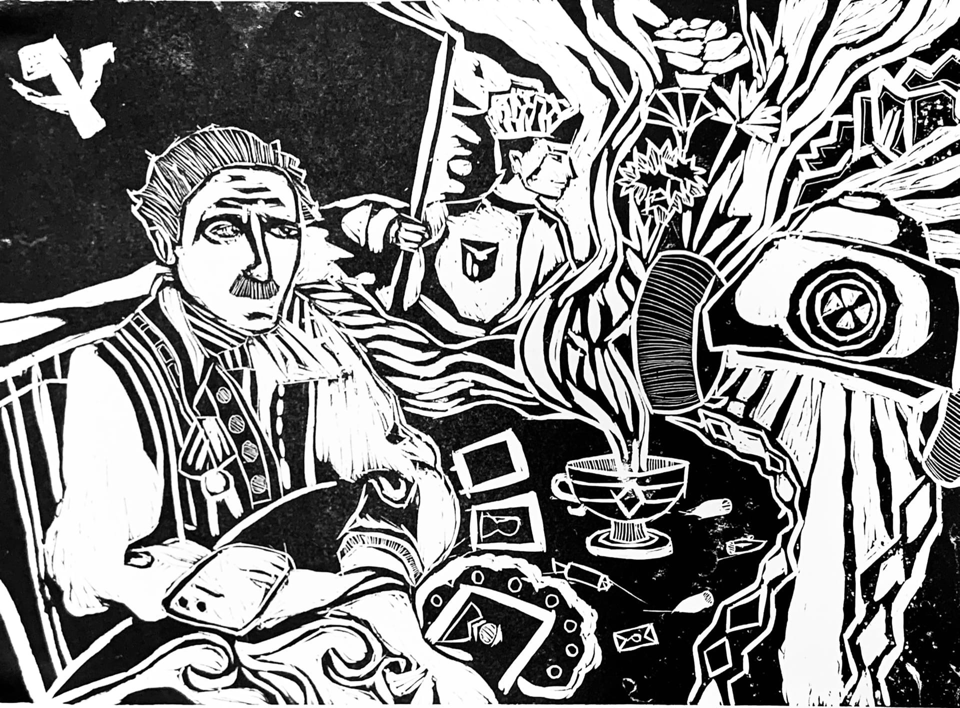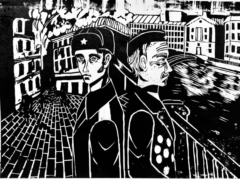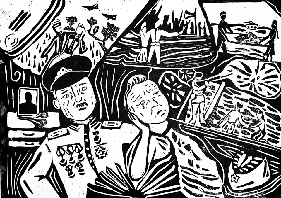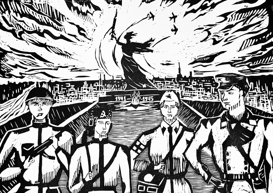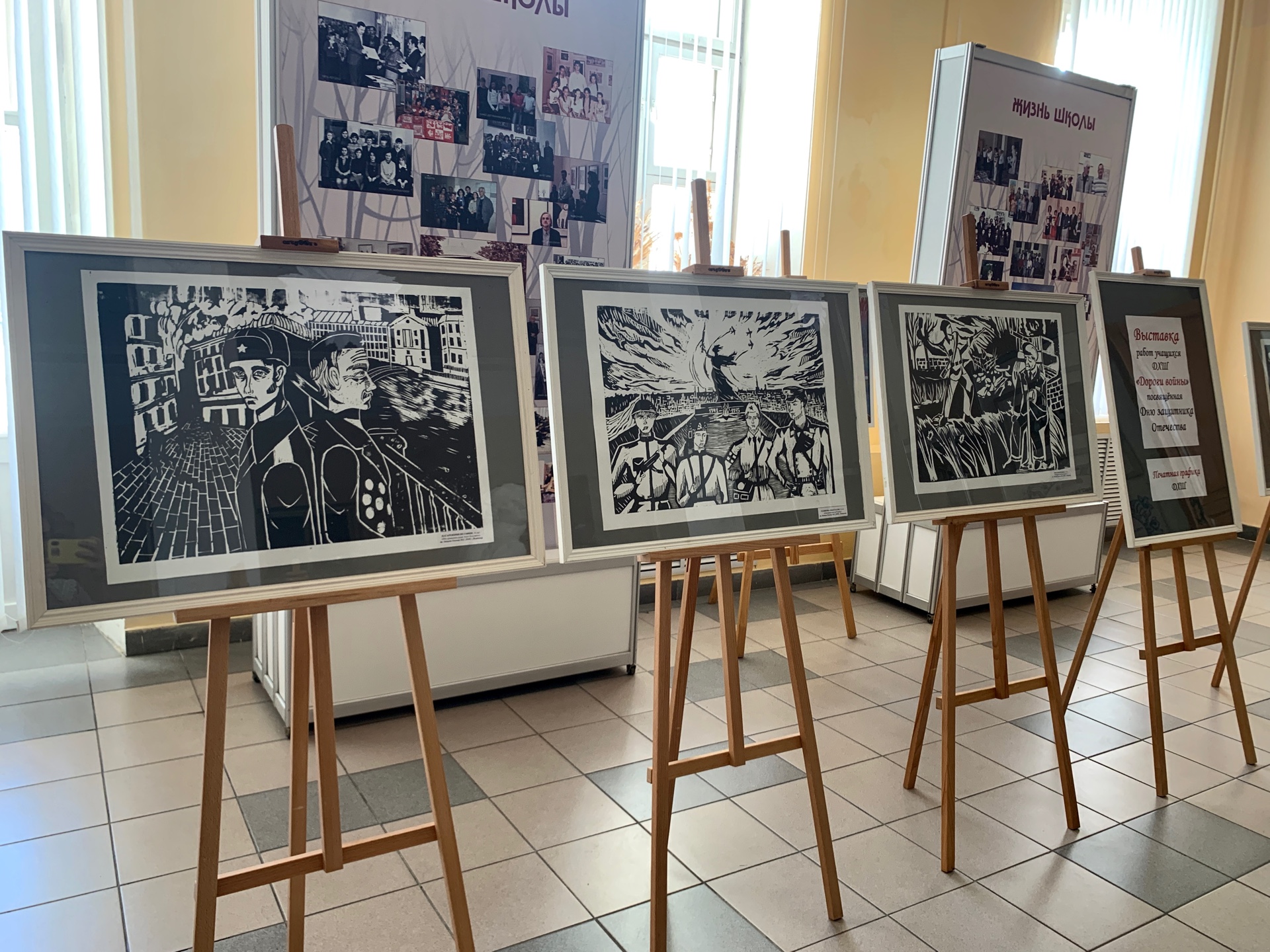 На выставку были отобраны лучшие графические листы учащихся студии печатной графики, которые отображают подвиги героев-защитников Отечества во время войны. Композиции относятся к интересной технике – гравюра на пластике с последующей печатью на офортном станке. Возраст участников 14-15 лет. В экспозиции можно увидеть рисунки, выполненные в различных жанрах – портреты и батальные композиции.